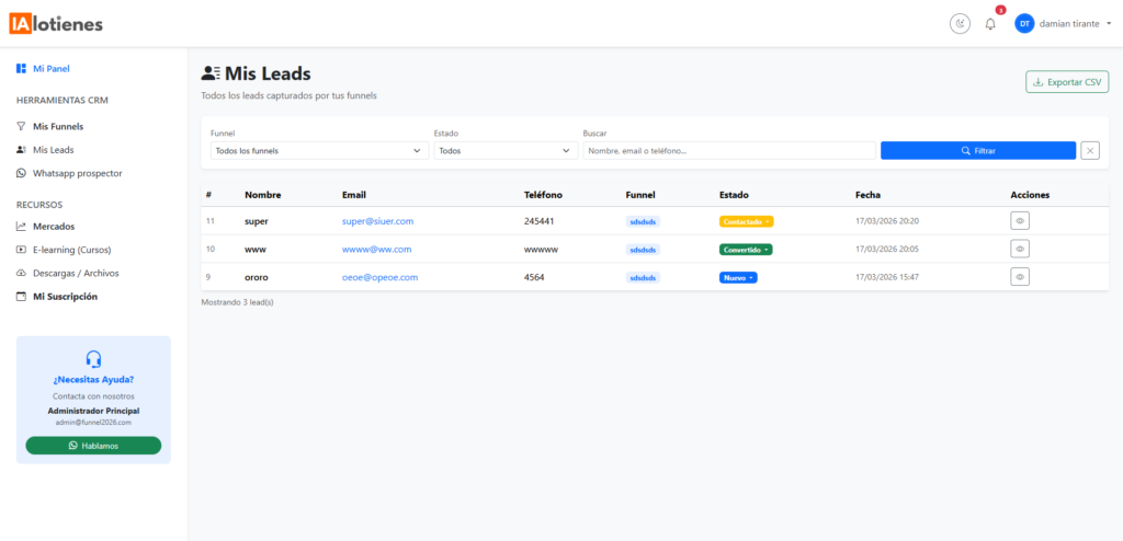 Un CRM centralizado donde cada lead capturado por tus usuarios se registra para su gestión de venta. Exporta en Excel/CSV con un clic.